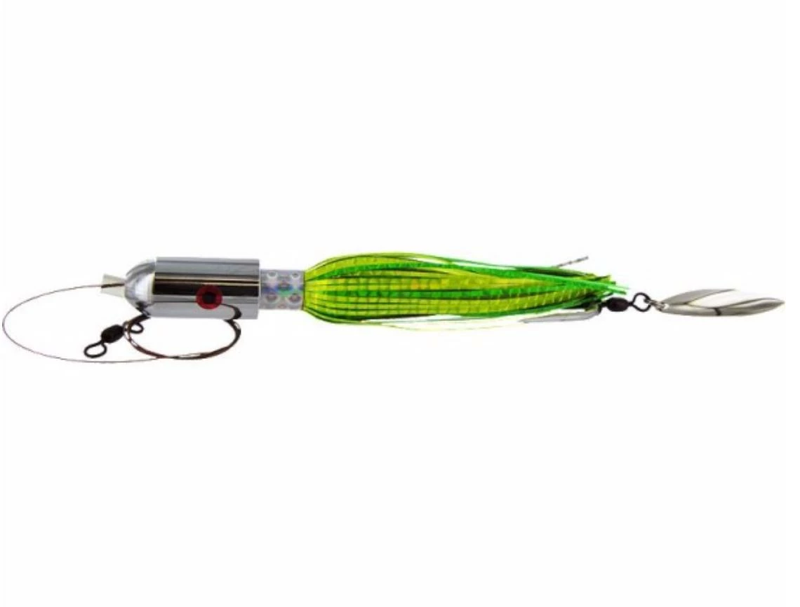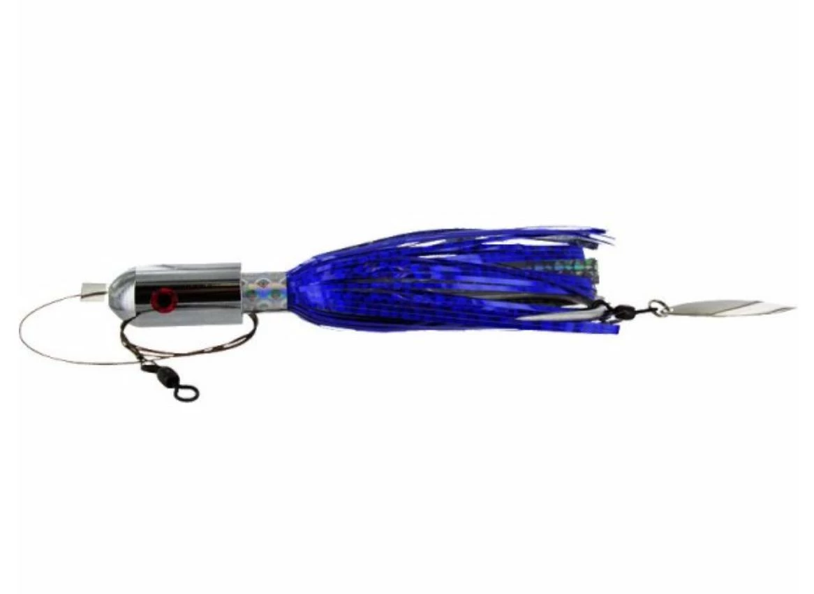 Catchy Tackle Wahoo Bombs are the best in the business with extreme attention to detail and quality components.  The mylar skirt gives off a ton action and flash while the willow blade of the rear spins on a heavy duty swivel.  The Catchy Tackle Wahoo Bombs are fitted with 4x strong hook will stand up to the biggest baddest fish in the ocean and the heavy wire and swivels won’t fail you.  If you target wahoo, tuna, or billfish, this lure is the bomb.