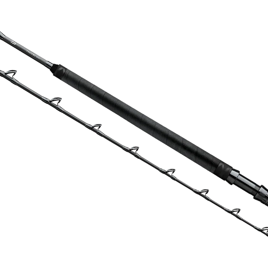 The Daiwa Proteus Tuna Special Rail Rod is the next evolution in big tuna rail fishing rods. Developed years ago, this technique has evolved into a much more private boat technique with the arrival of giant bluefin tuna here on the west coast. Extremely durable fore grip which is meant for resting on the rail This material is similar to tire rubber and can be moved up and down the rail without a scratch or without compressing.