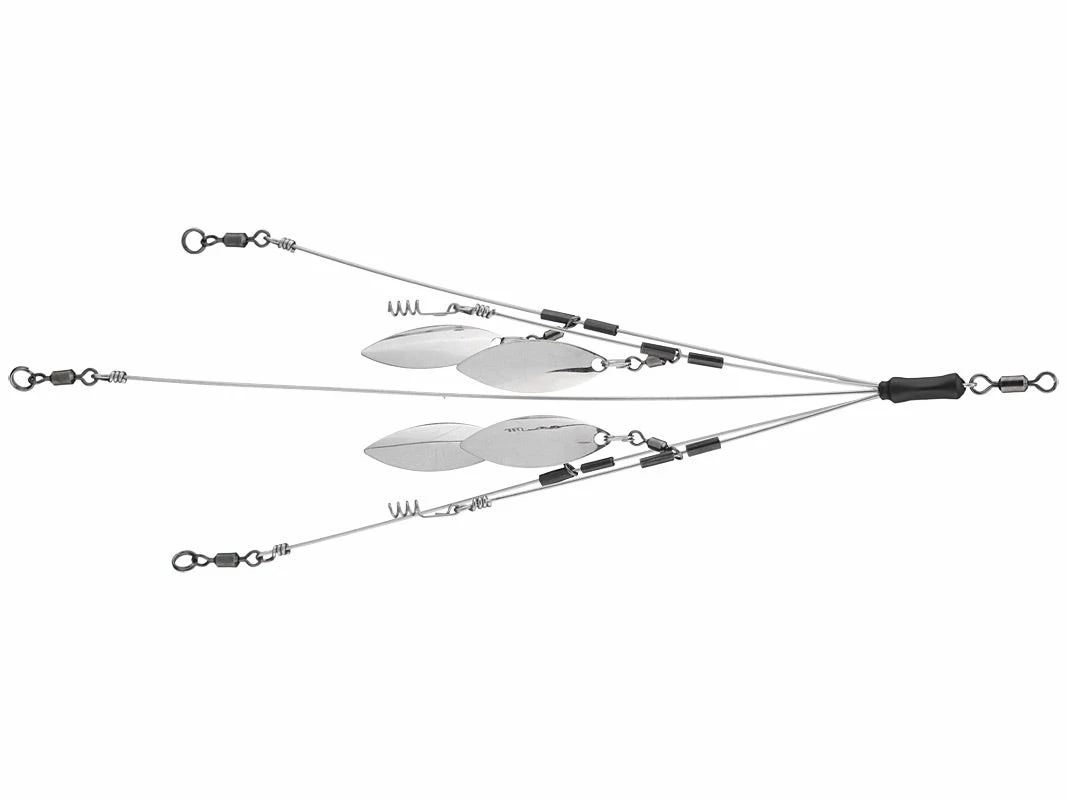 The G-Funk Bladed Cali G-Rig has two teasers and three hook capability. It comes in either Silver or Clear Lake camo wire. Each G-rig comes with springs already attached and owner hyper wire split rings to attach your swim bait head to. The Cali Bladed G-Rig also comes in a bladed and none bladed option to choose from; which consist of 4 individual blades.
