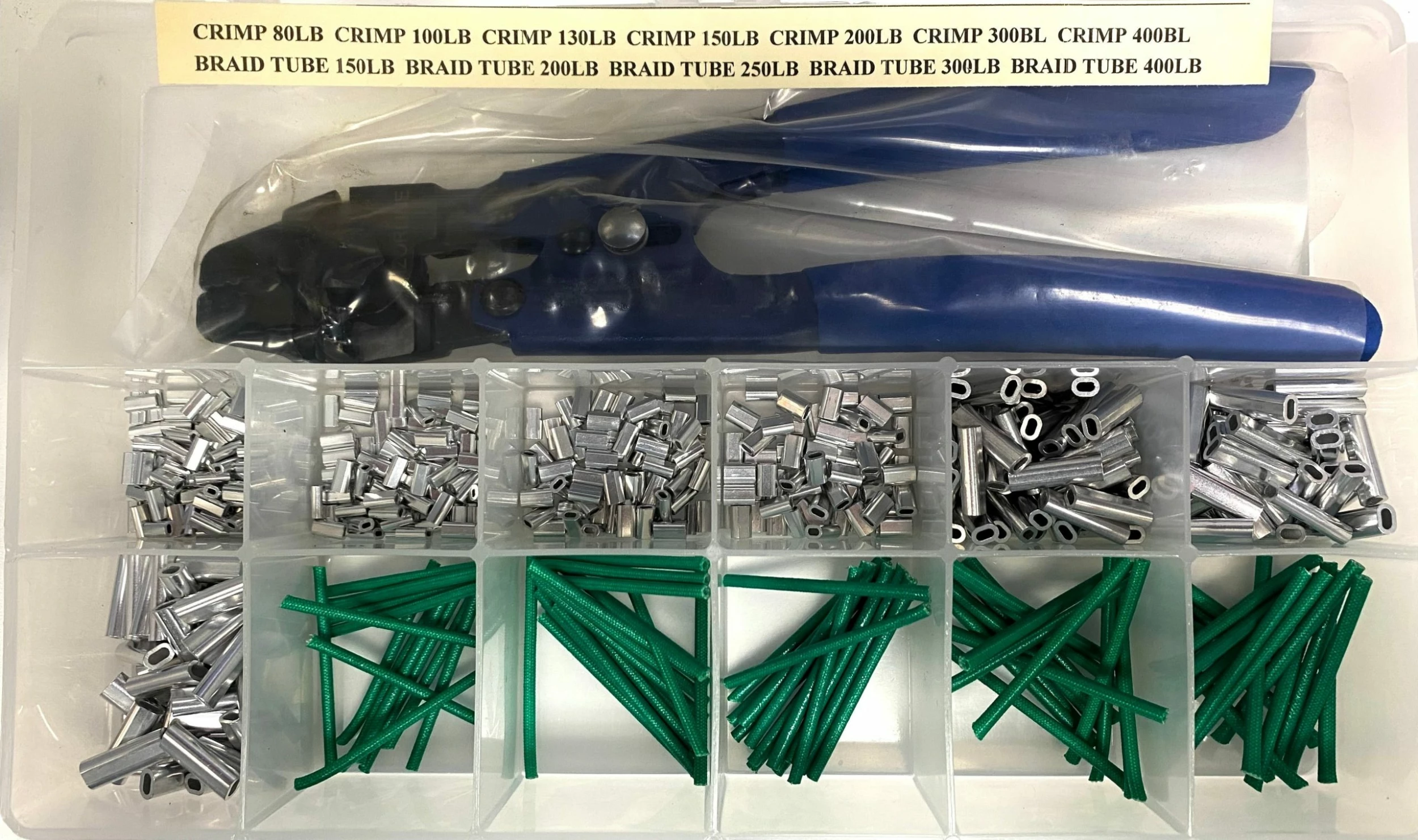 The Izorline Crimping Kit comes equipped with everything you need from fishing long range, heavy tuna fishing and even kite fishing. Comes with crimps as light as 80lb and as heavy as 400lb, and with all the corresponding braid tube chafe guards.