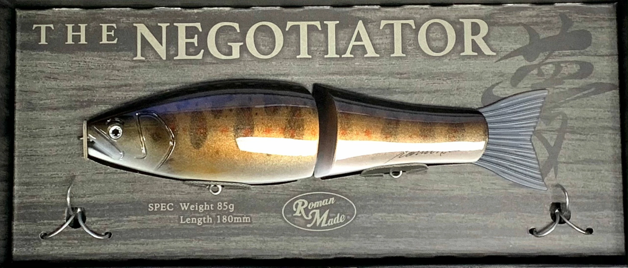 The New Roman Made Negotiator Premium David San T Swimbait has a new look but same killer action, Roman Made has combined realistic high definition imaging and there amazing and intensive hand painting and coating to create a more enticing and realistic profile. Hand carved, hand tuned and ready to target big bass, the Roman Made Negotiator is the staple in the line-up. This wooden swimbait is ideal when bigger fish are targeting larger bait fish or trout. The subtle “S” pattern entices fish from deeper water and gets them to strike violently.