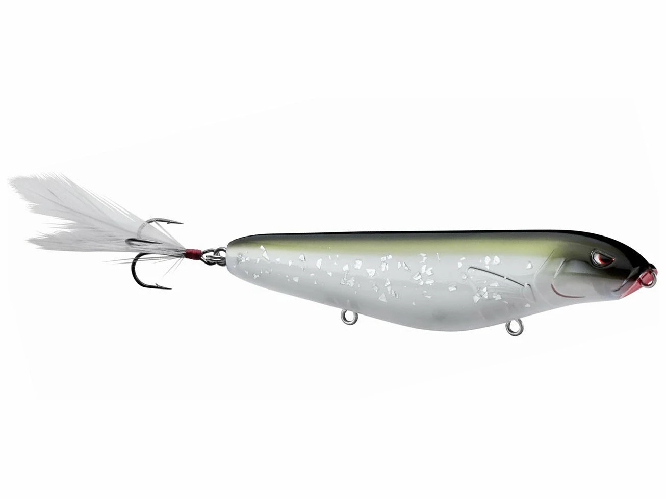Not only is the Fat Papa Walker slightly bigger than standard walk-the-dog topwaters, but unlike its cigar-shaped predecessors, it features a distinctly distended belly that pushes massive amounts of water. It enables anyone to create a wide “glide” without much effort. As a result, expert topwater anglers will be able to make it perform all sorts of fish-tempting tricks, while even rank beginners will get this baitfish imitator to work properly with minimal effort.